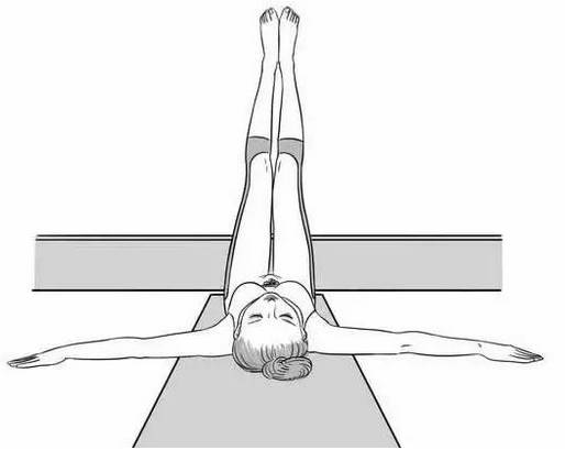平躺在床上,双腿并拢搭在墙壁上,双手平展在身体两侧,保持5至10分钟。这个体式可以把气血引到头部来滋养大脑细胞,从而改善脑供血、消除大脑疲劳。